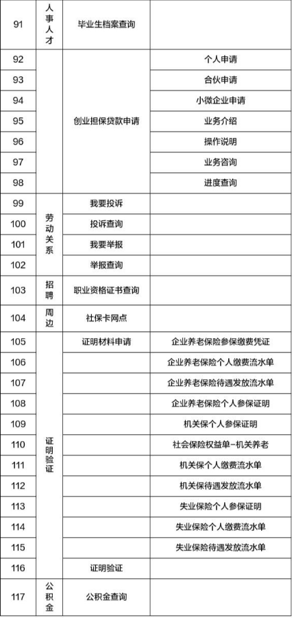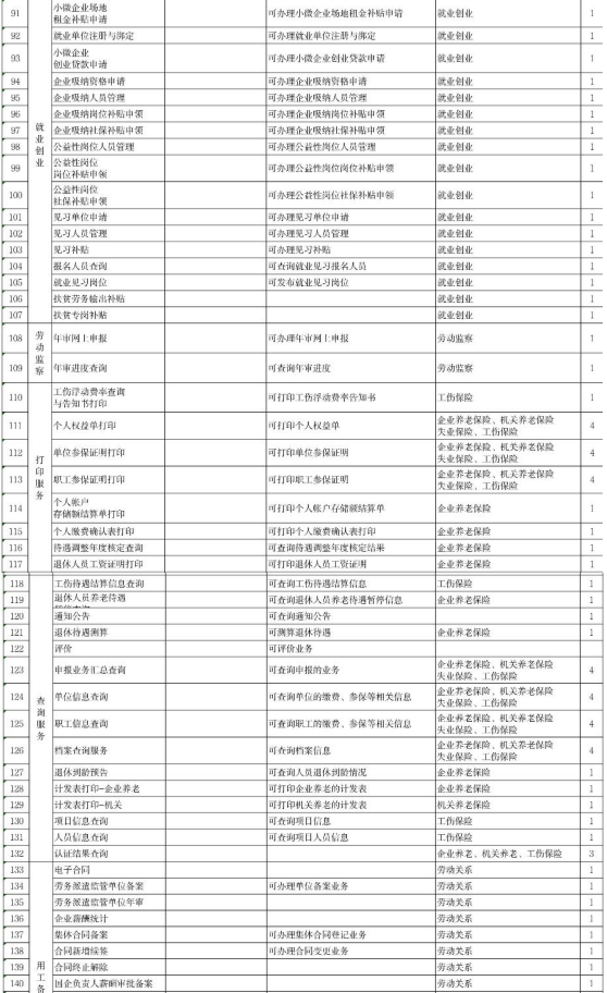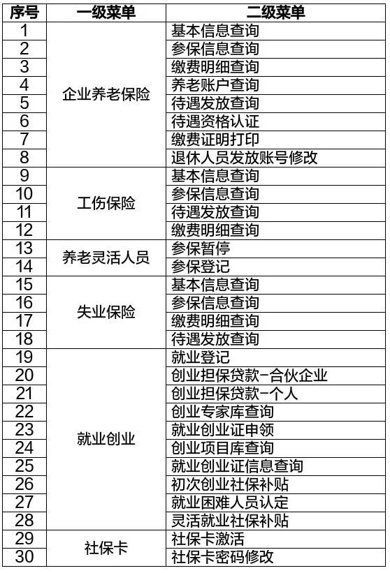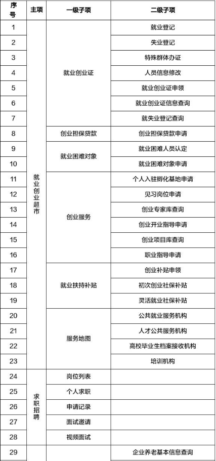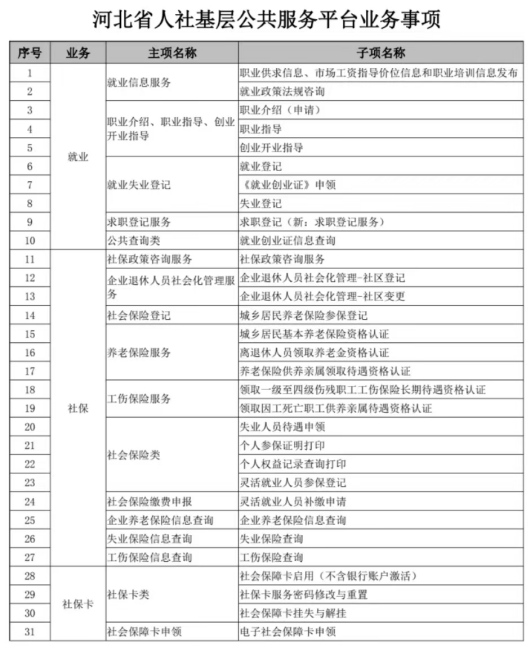 人社基层公共服务平台包括就业创业、社会保险、社会保障卡、政策咨询四大板块,第一批已上线事项共31项,包括就业领域的业务10项、社保领域的业务17项、社保卡领域的业务4项,后续会逐步增加。以下31项为目前可在平台办理的事项: