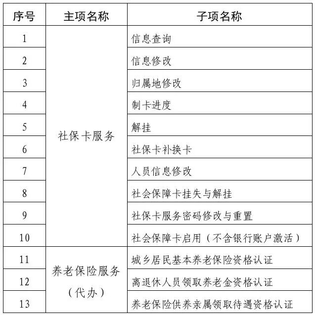 1、人社系统积极开展“社银合作”改革,在各银行设立社保卡服务网点258个,覆盖19个县区,可以办理10项社保卡业务,代办城乡居民基本养老保险资格认证等3项高频服务事项。补办社保卡全部免费、立等可取。不会使用智能手机的老人可就近刷脸免费认证。具体可办理的事项如下表:
