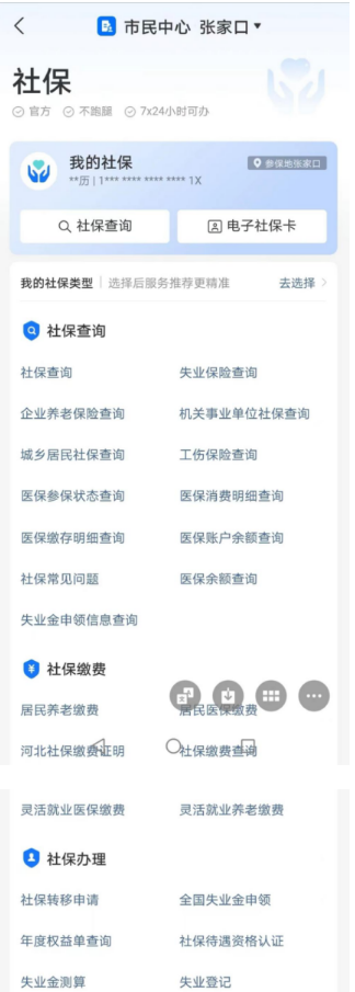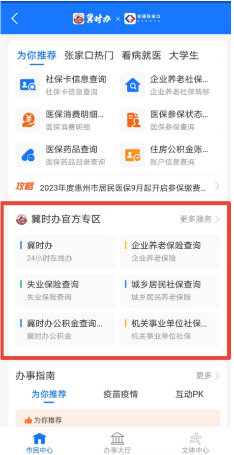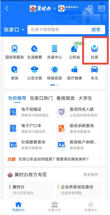人社服务功能,居民可以通过“支付宝市民中心模块”点击“冀时办”或在各大应用商店下载“冀时办”APP。