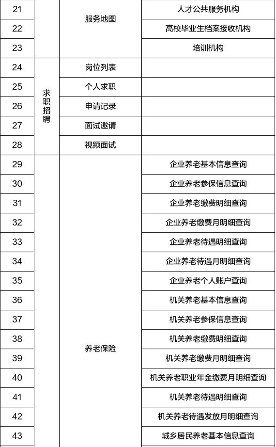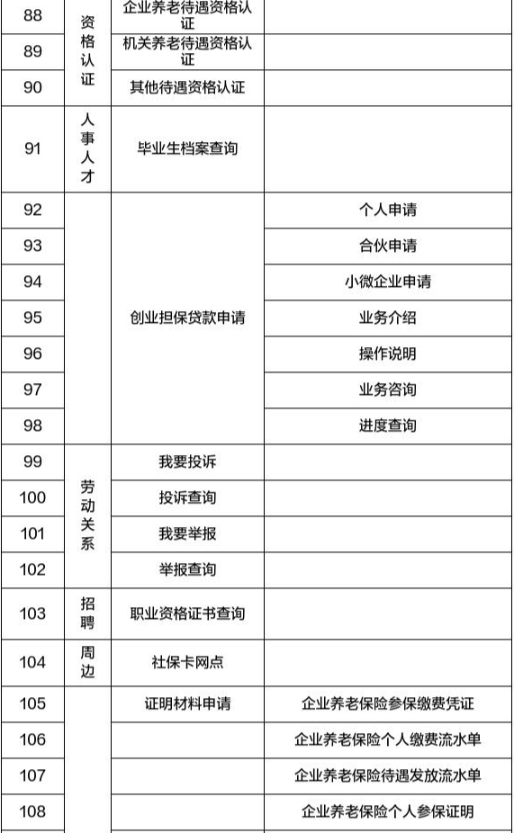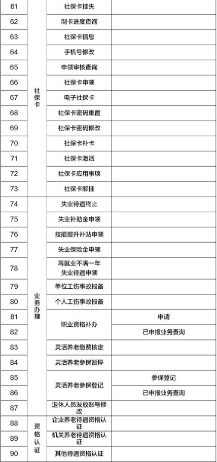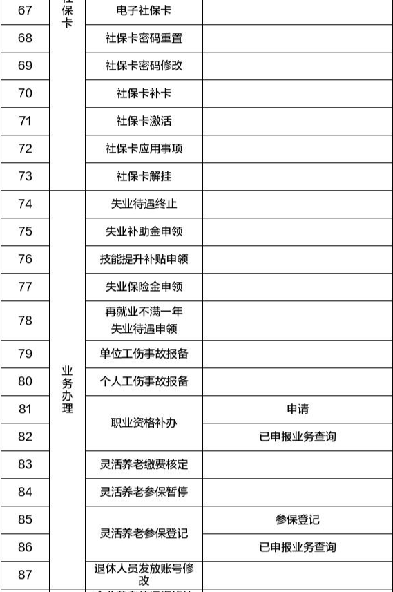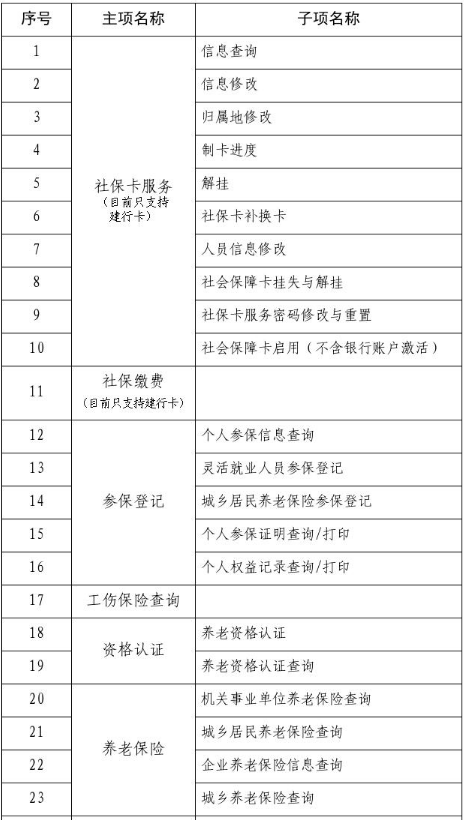 2、建设银行在部分行政村搭建了“裕农通”智能互动触摸屏,置入人社服务模块。截至目前,已在张家口各县区农村地区投放互动屏627台,覆盖17个县区、162个乡镇、627个行政村,可以办理养老保险、社保卡等28项人社高频服务事项,居民可以凭社保卡和身份证就近自助办理。具体可办理事项见下表: