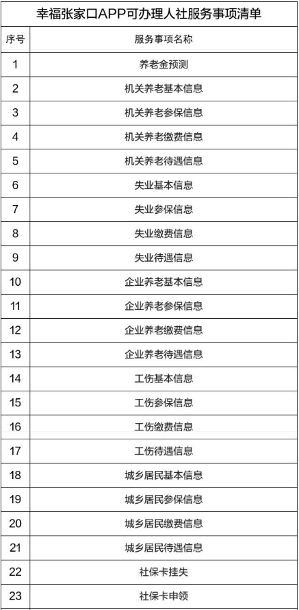 (三)幸福张家口APP。通过对接“幸福张家口APP”,设立“人社专区”,55项人社服务事项实现线上办理。居民可以通过各大应用商店进行下载,具体办理事项如下: